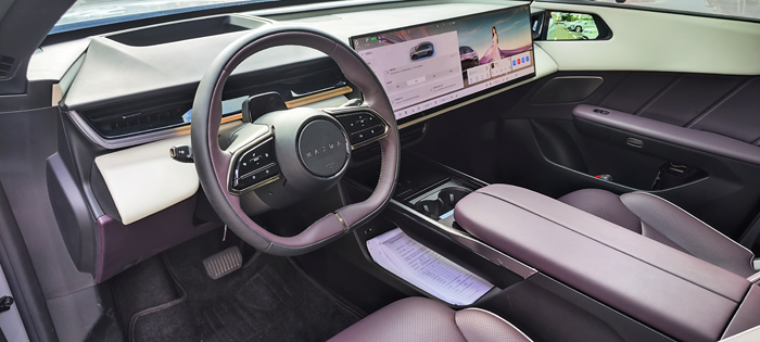 EZ-60前脸采用马自达品牌家族式设计元素,“立体光雕标志之翼” 灯带深度达 60mm,内置72颗高亮度灯珠,夜晚点亮时璀璨夺目,如同水晶般通透立体,带来独一无二的车辆辨识度。新车共提供7种车漆颜色,其中专属的“星云紫”“水天蓝”车漆采用2 - 12μm超细腻珠光颗粒,随角异色性高达 23.7,采用“湿碰湿”三层喷涂工艺,不仅外观亮丽,还能长久保持车身漆面的完美状态。