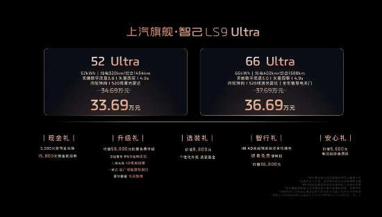 11月4日,上汽旗舰·智己LS9全球首发并正式开启预售。新车首发两个增程版本,全系皆Ultra:52Ultra版,预售权益价33.69万元;66Ultra版,预售权益价36.69万元。