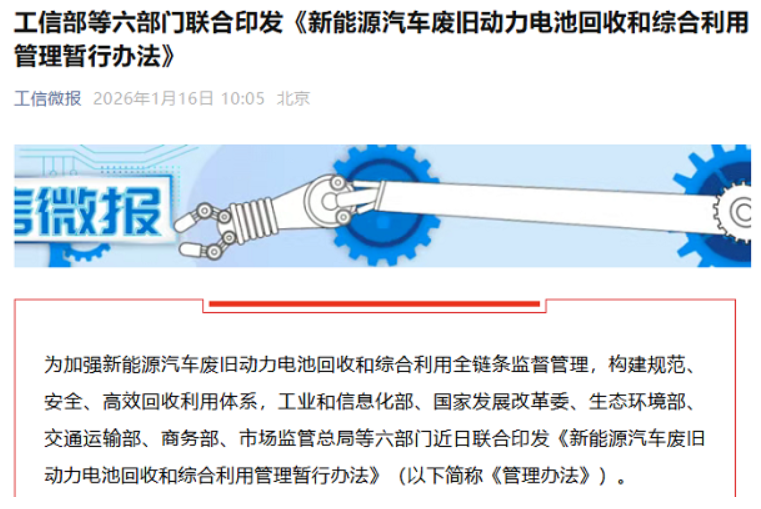 今日,工业和信息化部等六部门联合发布《新能源汽车废旧动力电池回收和综合利用管理暂行办法》(以下简称“管理办法”),提出遵循“全渠道、全链条、全生命周期”的管理思路,涵盖重点设计“车电一体报废”、建立新能源汽车动力电池数字身份证管理制度等。新规自2026年4月1日起施行。