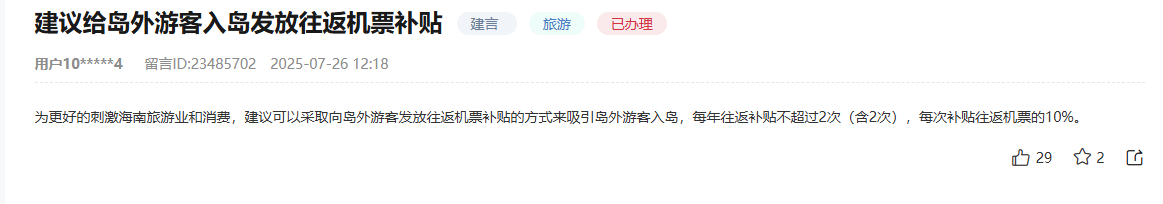 人民建议 | 群众建议给岛外游客发放机票补贴 海南:每年都安排