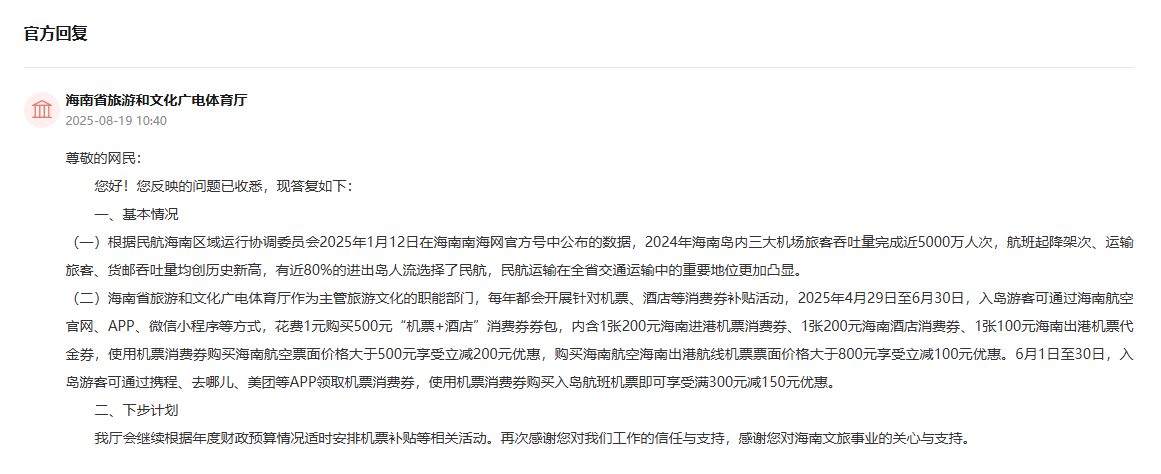 收到群众建议后,海南省旅游和文化广电体育厅积极回复,该厅作为主管旅游文化的职能部门,每年都会开展针对机票、酒店等消费券补贴活动,2025年4月29日至6月30日,入岛游客可通过海南航空官网、APP、微信小程序等方式,花费1元购买500元“机票+酒店”消费券券包,内含1张200元海南进港机票消费券、1张200元海南酒店消费券、1张100元海南出港机票代金券,使用机票消费券购买海南航空票面价格大于500元享受立减200元优惠,购买海南航空海南出港航线机票票面价格大于800元享受立减100元优惠。6月1日至30日,入岛游客可通过携程、去哪儿、美团等APP领取机票消费券,使用机票消费券购买入岛航班机票即可享受满300元减150元优惠。下一步,海南省旅游和文化广电体育厅会继续根据年度财政预算情况适时安排机票补贴等相关活动。