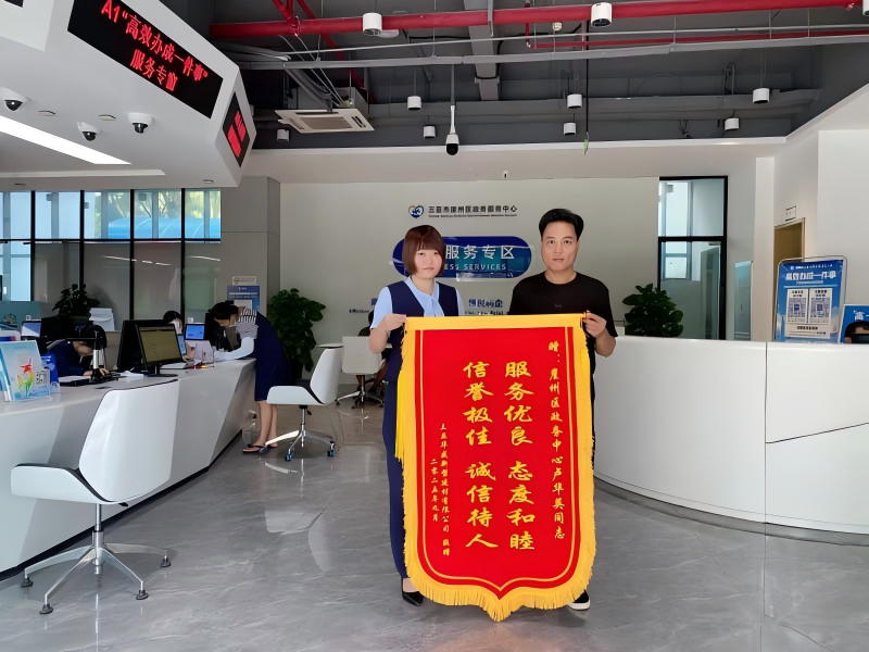 三亚华盛新型建材有限公司负责人向崖州区政务服务中心送锦旗。崖州区政务服务中心供图