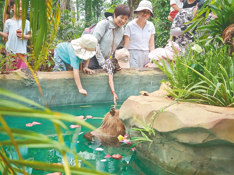 海南热带野生动植物园,游客和“卡皮巴拉”水豚互动。海南日报全媒体记者 封烁 摄