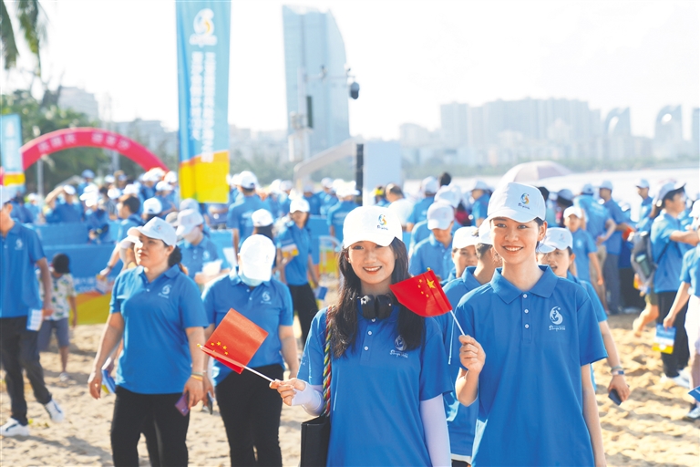 在倒计时200天之际,以“庆国庆 迎亚沙”为主题的沙滩健步走活动在三亚湾活力上演。数百名参与者从海月广场出发,沿着风景如画的三亚湾海岸线行进,全程约2公里。