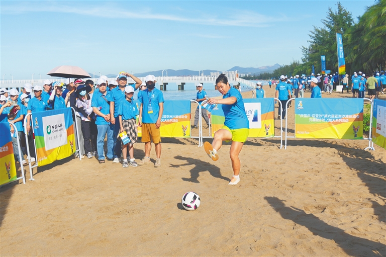 市民游客体验沙滩足球。