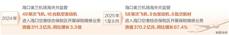数据是最直观的证明:2024年,海口美兰机场海关共监管49架次飞机、16台航空发动机进入海口空港综合保税区开展保税维修业务,货值311.3亿元,同比增长3.3倍。2025年1至8月,海口美兰机场海关共监管58架次飞机、9台发动机、6批次航材入区开展保税维修,货值370.2亿元,同比增长67.4%。