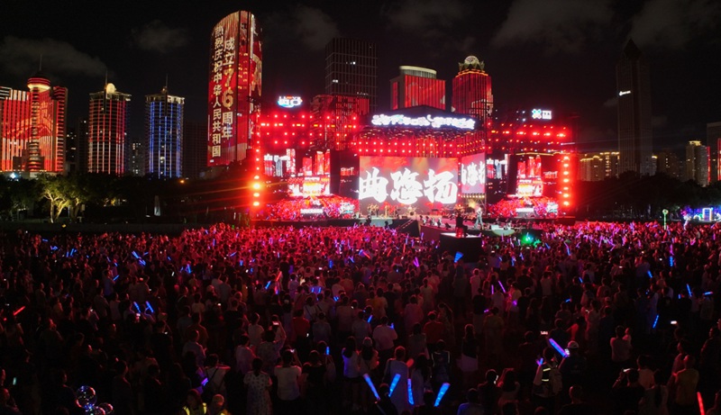 国庆假期的海口,文化氛围格外浓郁。作为2025海口艺术周的亮点活动,2025“夸下海口”草坪音乐会在万绿园盛大开启,首日“华语嘉年华之夜”以时代金曲引发全场共鸣,当《我和我的祖国》旋律响起,万人同声合唱,将现场气氛推向高潮。夜幕下,近千架无人机编队表演点亮夜空,绘就“祝福祖国”等璀璨图景,成为社交媒体热门话题。据统计,截至目前草坪音乐会吸引约17万名市民游客现场观看。据了解,2025“夸下海口”草坪音乐会还将持续至10月11日,每天19:30-22:30准时在万绿园上演。