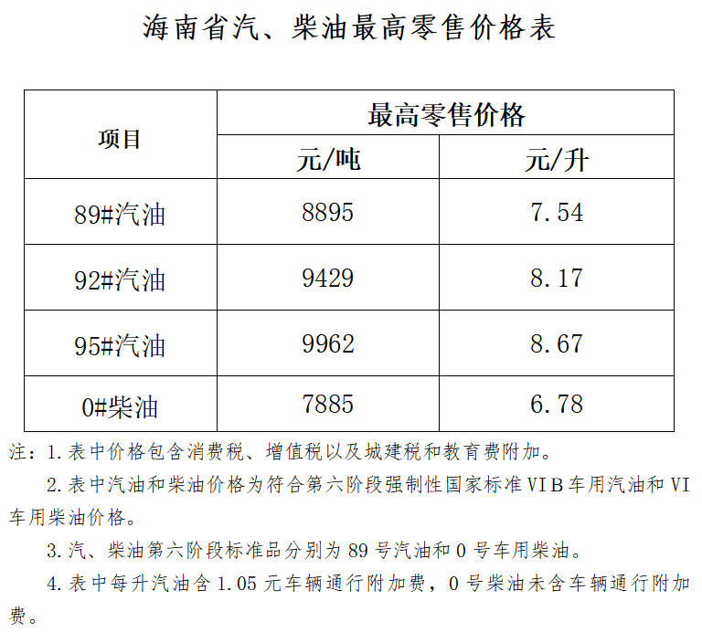 人民网海口10月13日电 (记者孟凡盛)根据国家发展改革委官网新闻发布中心2025年10月13日公布的国内成品油价格调价信息,国内汽、柴油价格(标准品)每吨分别下调75元和70元。海南省发展改革委按照现行成品油价格形成机制调整海南省汽、柴油最高零售价格,自2025年10月13日24时起执行。