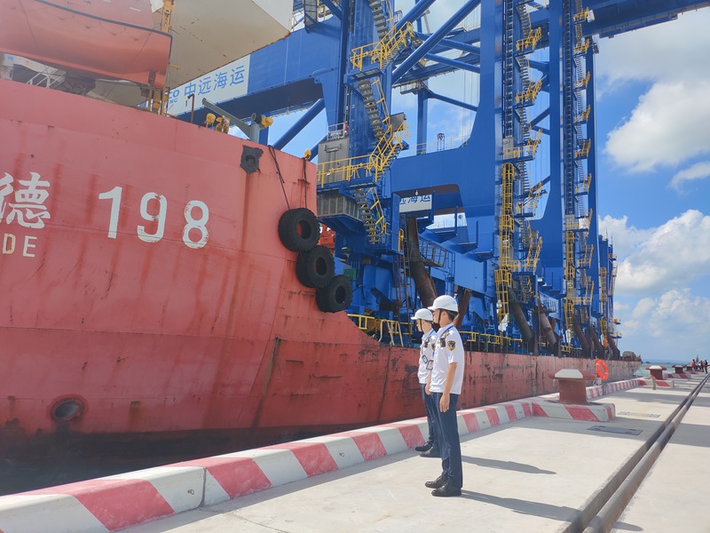 海事执法人员巡查岸桥设备安装现场。洋浦海事局供图