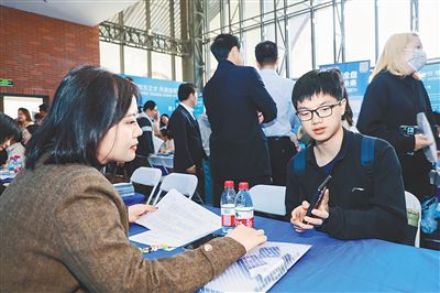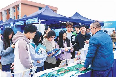 ③在校招活动(杭州站)现场,学生与用人单位面对面交流。
