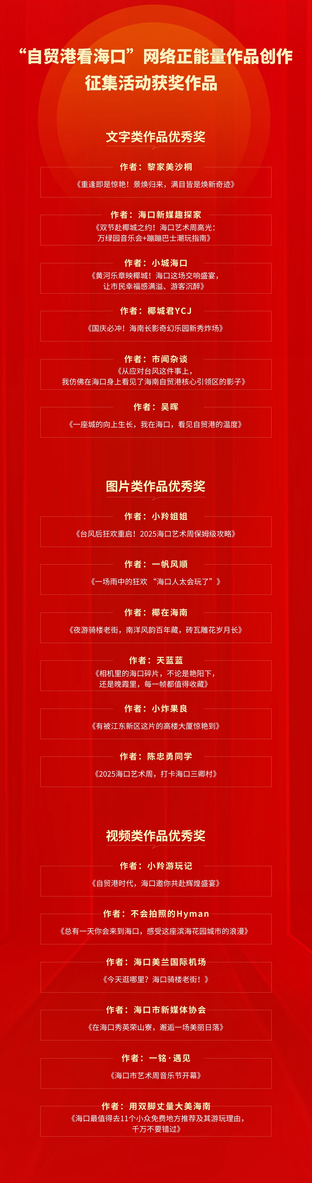 由海口市委网信办主办的2025年“自贸港看海口”网络正能量作品创作征集活动,自启动以来,广大网民积极参与,经过作品初筛、初评、打分、专家审核评议等环节,共产生18件网络正能量优秀作品(文字、图片、视频各类6件作品),现将获奖作品给予公布。