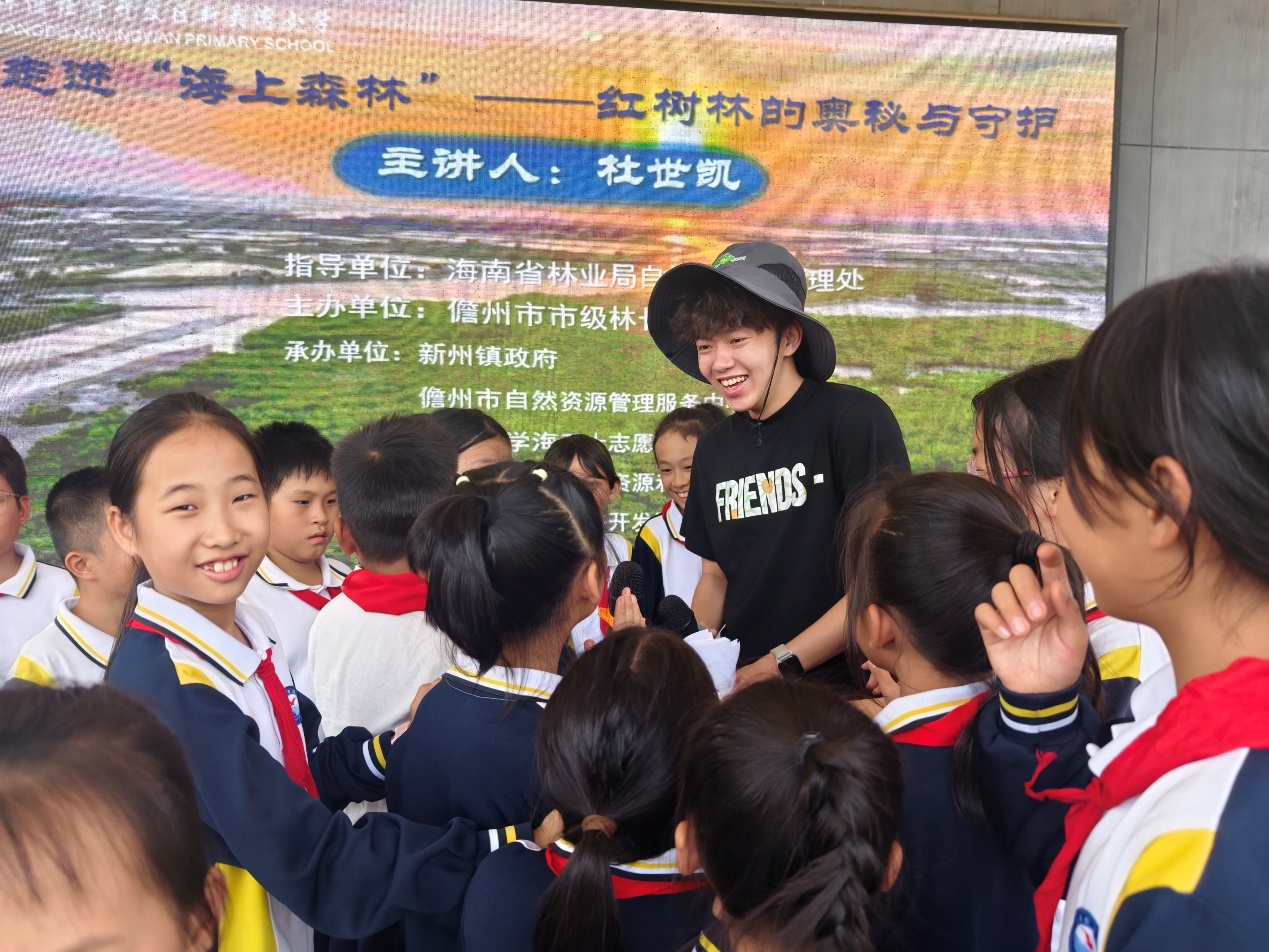 当天,“生态+文化”双轨宣教活动率先拉开帷幕。在新英湾小学,海南大学学生志愿者以“红树林:湿地生态的守护者与儋州历史的见证者”为题开展科普宣讲,既系统阐释红树林作为“海岸卫士”的防风固沙、净化海水等生态功能及独特生长特性,又结合儋州明清时期海防古碑记载,追溯红树林与当地渔耕文化的千年联结。小学生们不时举手提问,在互动中深化对本土生态与历史的认知。