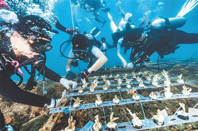 志愿者潜入三亚大东海海底种植珊瑚苗,为修复海底生态系统播撒“蓝色希望”。海南日报全媒体记者 王程龙 摄