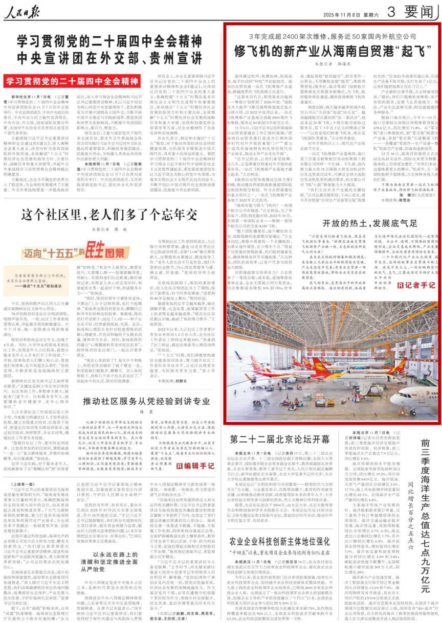 据海口海关统计,今年1—10月,海口空港综合保税区保税维修货值达478.6亿元,同比增长71.8%。从“零关税”进口维修航材,到“零关税”购置生产设备,再到“零关税”引进整架飞机……一条覆盖“零部件—生产设备—整机”的航空产业链,在海南逐渐成形。