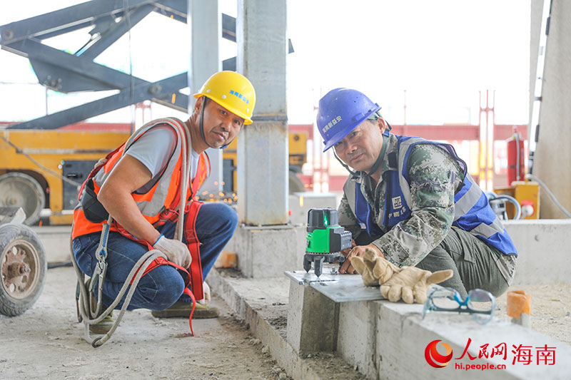 两位工人正通过水平仪”找水平“。人民网记者 牛良玉摄