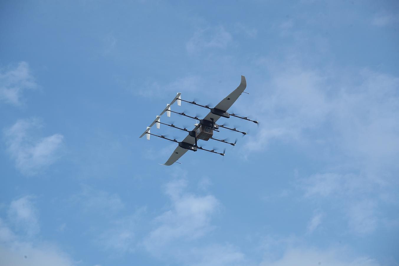 执行跨海运输任务的无人机在飞行中。王海滢摄