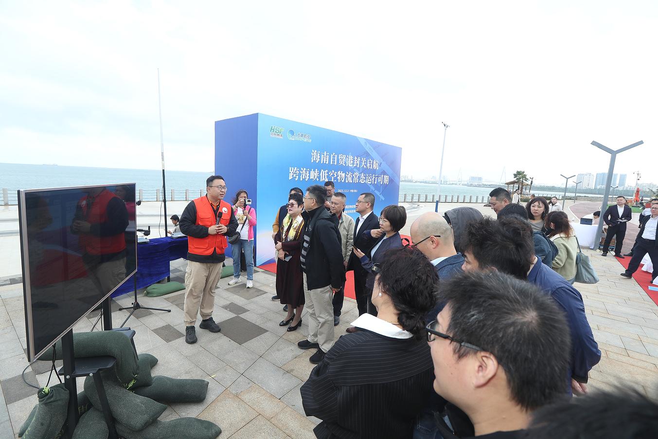 大鹏航空相关负责人在现场介绍跨越琼州海峡低空物流航线运行情况。王海滢摄