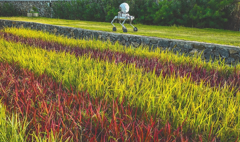 12月8日,三亚崖州区国家野生稻种质资源圃迎来“新农人”——工业级机器狗。它身披高精度定位、视觉感知与多模态传感设备“战甲”,在田埂间灵活穿梭,精准采集水稻表型数据,以智能化突破传统人工采集局限,为农业科研注入新动力。海南日报全媒体记者 张茂摄