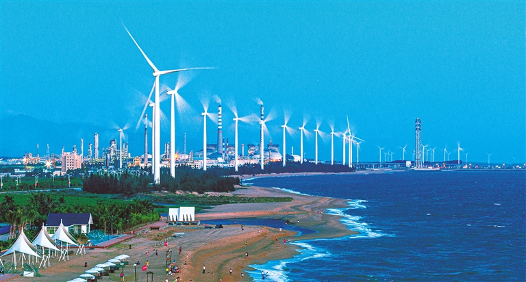 远处是迎风转动的风电机组,近处是整齐排列的光伏板阵,清洁电力正源源不断送入千家万户、产业园区。在东方市感城港湾,风电基地与湛蓝大海相映成景,每年2.49亿千瓦时的绿电输出,见证着海南清洁能源岛建设的坚实步伐。