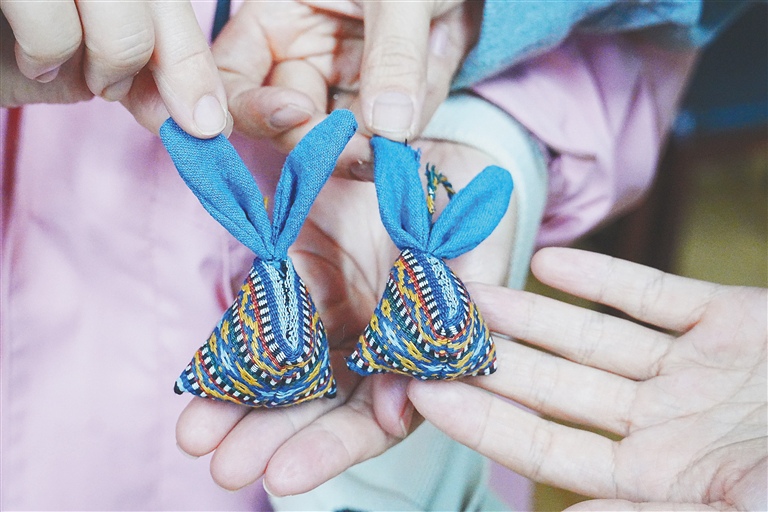 课堂进入尾声时出现了有趣的现象。尽管教学内容相同,但学员们最终完成的黎锦香囊却形态各异,创意十足。“大家很少拘泥于模仿,总会加入自己的巧思,这让每件作品都独一无二,也是让非遗活在当下的最好体现。”王忠文深感愉悦。毫无基础的青年们在专业指导下,参与到从无到有的制作过程,并在其中融入自己的想法与创意,成为了黎锦的“野生传承人”。
