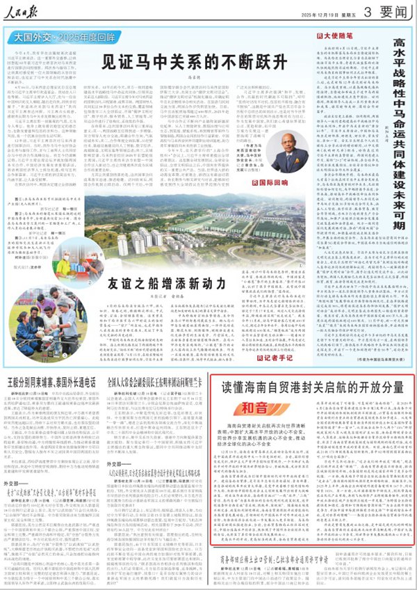 12月18日,海南自由贸易港正式启动全岛封关运作,这是中国改革开放进程中又一个历史性时刻。当前,国际形势变乱交织,保护主义严重冲击国际经贸秩序,一个不断扩大高水平对外开放的中国为世界增添信心、贡献机遇,充分彰显引领时代的格局与担当。