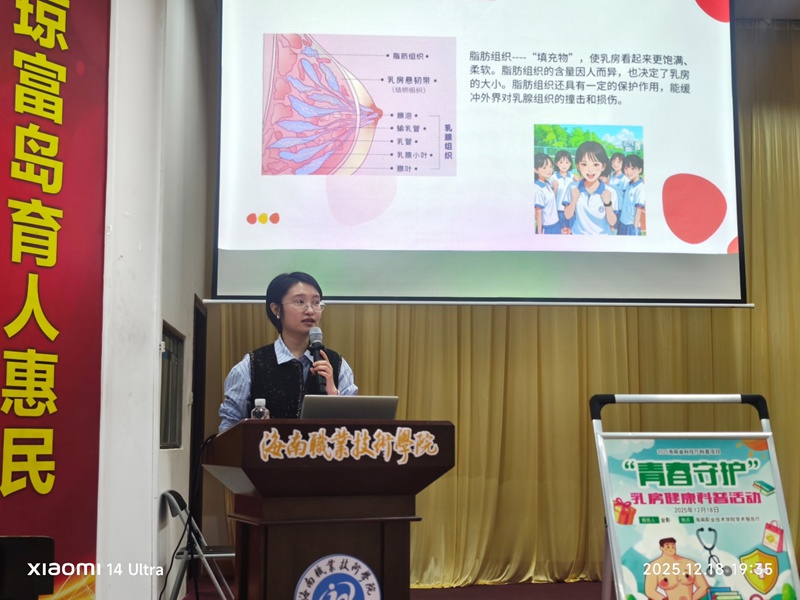 人民网海口12月23日电 (记者李学山)12 月 18 日,一场主题为“守护青春乳房健康,筑牢成长健康防线”的科普宣教活动在海南职业技术学院(简称“海职院”)温情开展。此次活动由海南省肿瘤医院主办,旨在将专业的乳房健康知识送入校园,吸引了400余名在校学生与女性教师积极参与。活动通过专题讲座、互动问答、科普资料发放等多种形式,为青春期女性提供了亟需的健康指导。