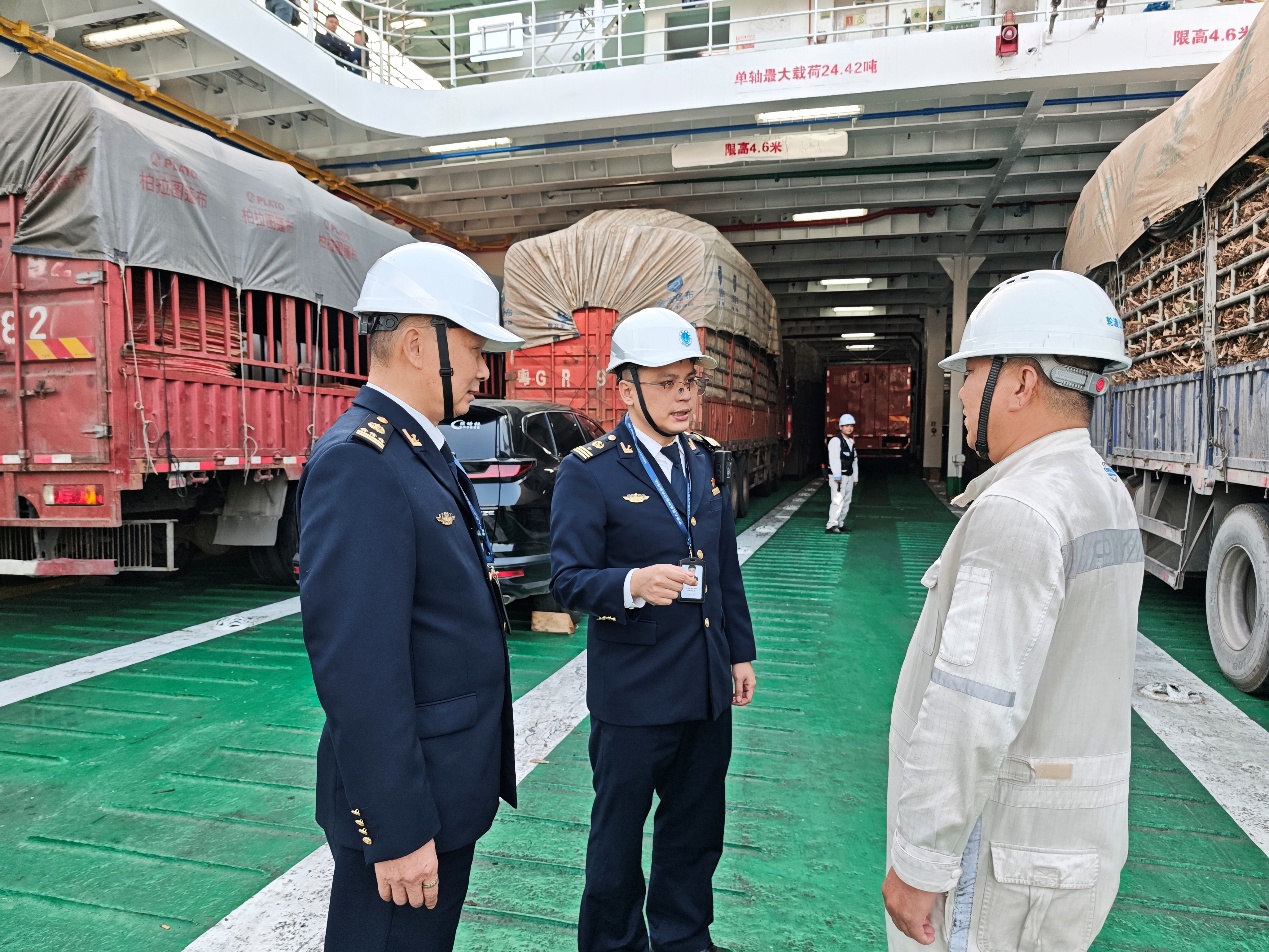 海事执法人员开展客滚船检查。海口海事局供图