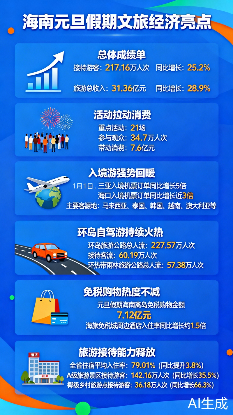 海南自贸港封关后首个元旦假期活力四射,跨年演艺、免税购物、环岛自驾、入境回暖……这个元旦,海南文旅人气与消费两旺,交出了一份亮眼的新年答卷。