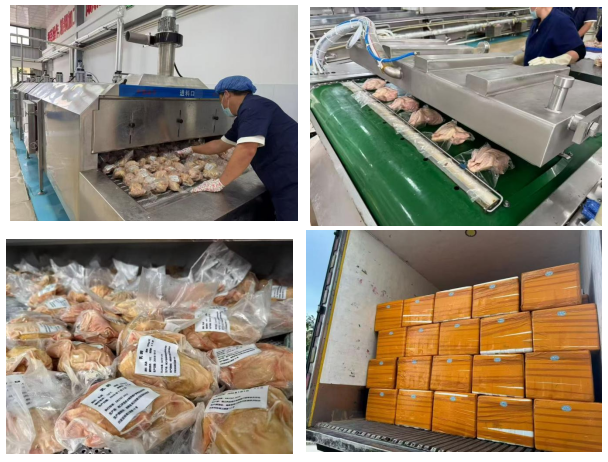 在椰鸽肴养殖基地生产车间内,完整的流水线正平稳运行。经过合规宰杀、多道清洗的乳鸽,被迅速送入真空包装区,封装后立即转入速冻隧道进行急冻锁鲜。最终,经过严格检验的产品被整齐码放入专用冷链箱。