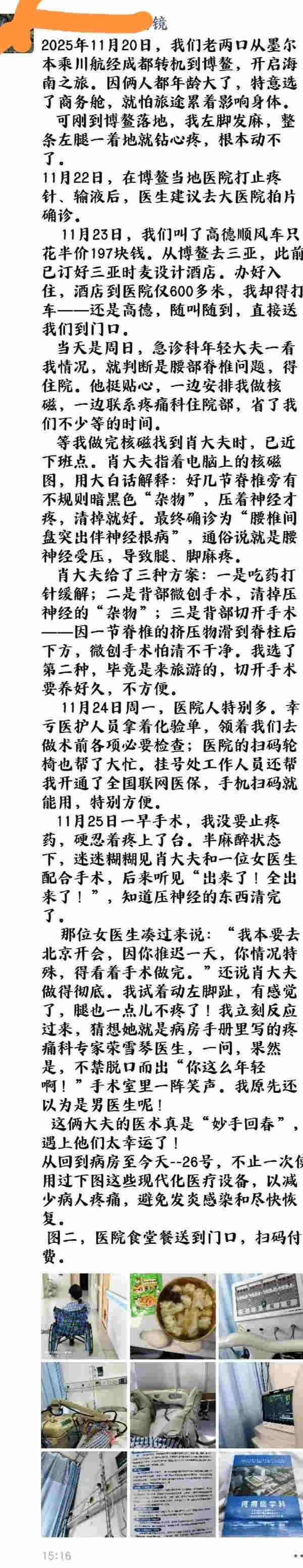 术后,老人的康复之路被细致规划,病房内现代化医疗设备持续助力减痛防感染,次日康复师便上门指导护腰佩戴、下地步骤及活动时长,量身定制康复操并发送教学视频;护理团队陪同术后核磁复查,确保手术效果;扫码轮椅、手机医保结算等智慧服务,让异地就医的老两口全程省心。 作为全国医保联网结算定点医疗机构,医院工作人员主动协助老人开通异地医保,切实减轻了就医负担。从术后次日能自主活动,到11月28日顺利出院,短短五日,老人便从行走困难恢复至正常步态。