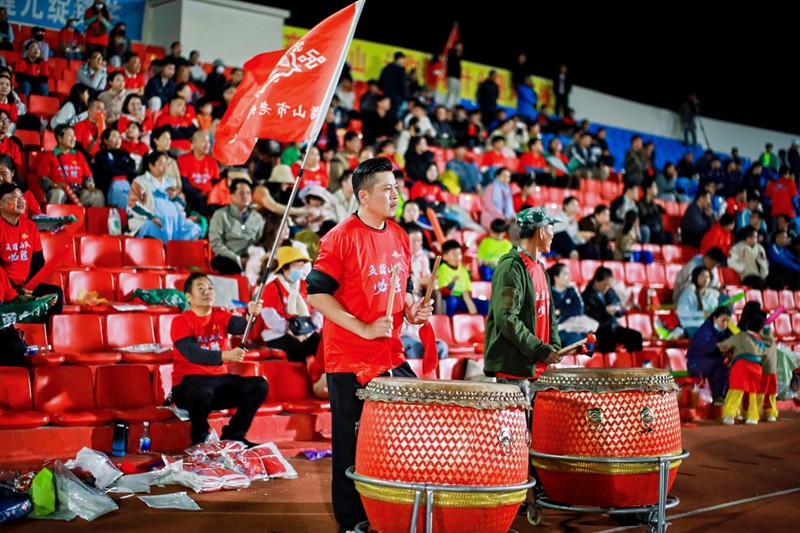 比赛现场气氛火热,由本地忠实球迷组成的红色助威方阵呐喊声震彻全场。此前历经七场鏖战的五指山队,在家乡父老的助威声中爆发出强大战斗力。上半场,主队便连入三球,迅速点燃全场激情,看台上战旗飘扬,鼓声与欢呼此起彼伏。