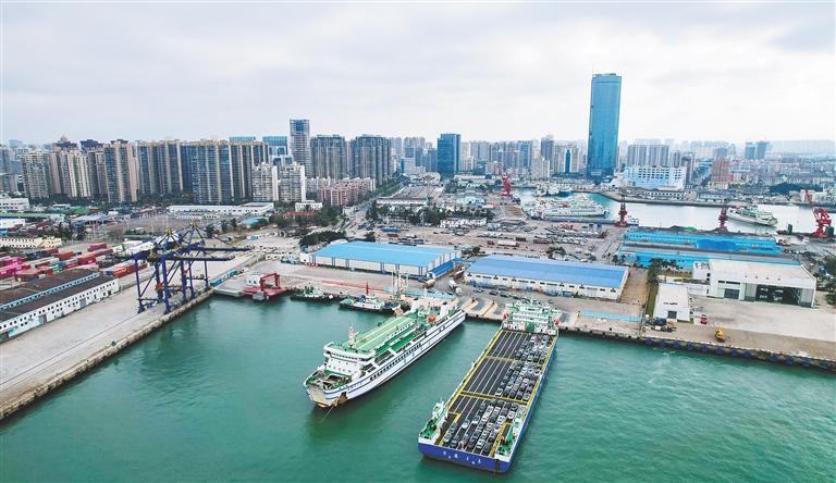 图为1月30日拍摄的海口秀英港。春运期间,海口积极扩充船舶运力,共计有57艘船舶和4艘新能源汽车专用平板驳船投运。新华社记者 杨冠宇 摄