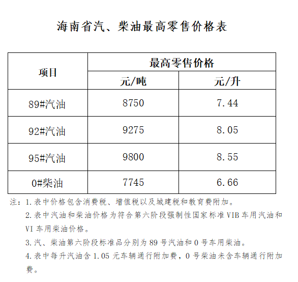 海南省成品油价格上调 92#汽油8.05元/升
