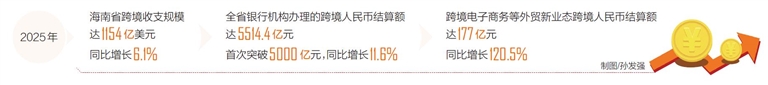 发布会介绍,2025年,海南省跨境收支规模达1154亿美元,同比增长6.1%,规模上升至全国中等水平;全省银行机构办理的跨境人民币结算额达5514.4亿元,首次突破5000亿元,同比增长11.6%,其中,跨境电子商务等外贸新业态跨境人民币结算额达177亿元,同比增长120.5%。