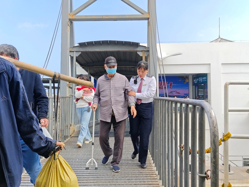 “请大家有序排队,注意脚下安全。”结束完准备工作,刘霞又风风火火赶到登船梯口,一边引导旅客,一边留意着人群中的特殊身影。见到一位老人右手拄着拐杖艰难前行,她立即上前扶住老人左臂,搀扶老人至客舱座位,并轻声嘱咐:“阿叔,座位在这里,航行中如有需要随时叫我们。”