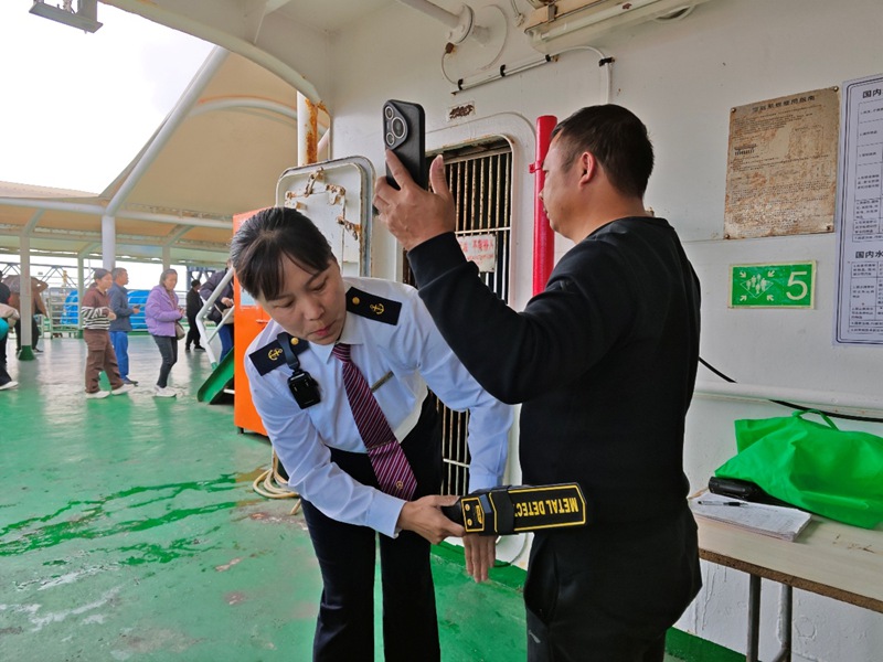 “您好,请配合安检。”在司机安检岗位,刘霞手持安检仪,神情专注,动作规范而细致。她一边轻声提示,一边在旅客身旁及随身行李处缓慢移动检测设备,在得到司机旅客的允许后,仔细翻看行李,不放过任何一处可能藏匿风险的位置。她深知“安全无小事”,每一次抬手检测、每一句提醒,都关乎全船旅客的安全。