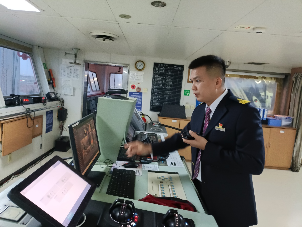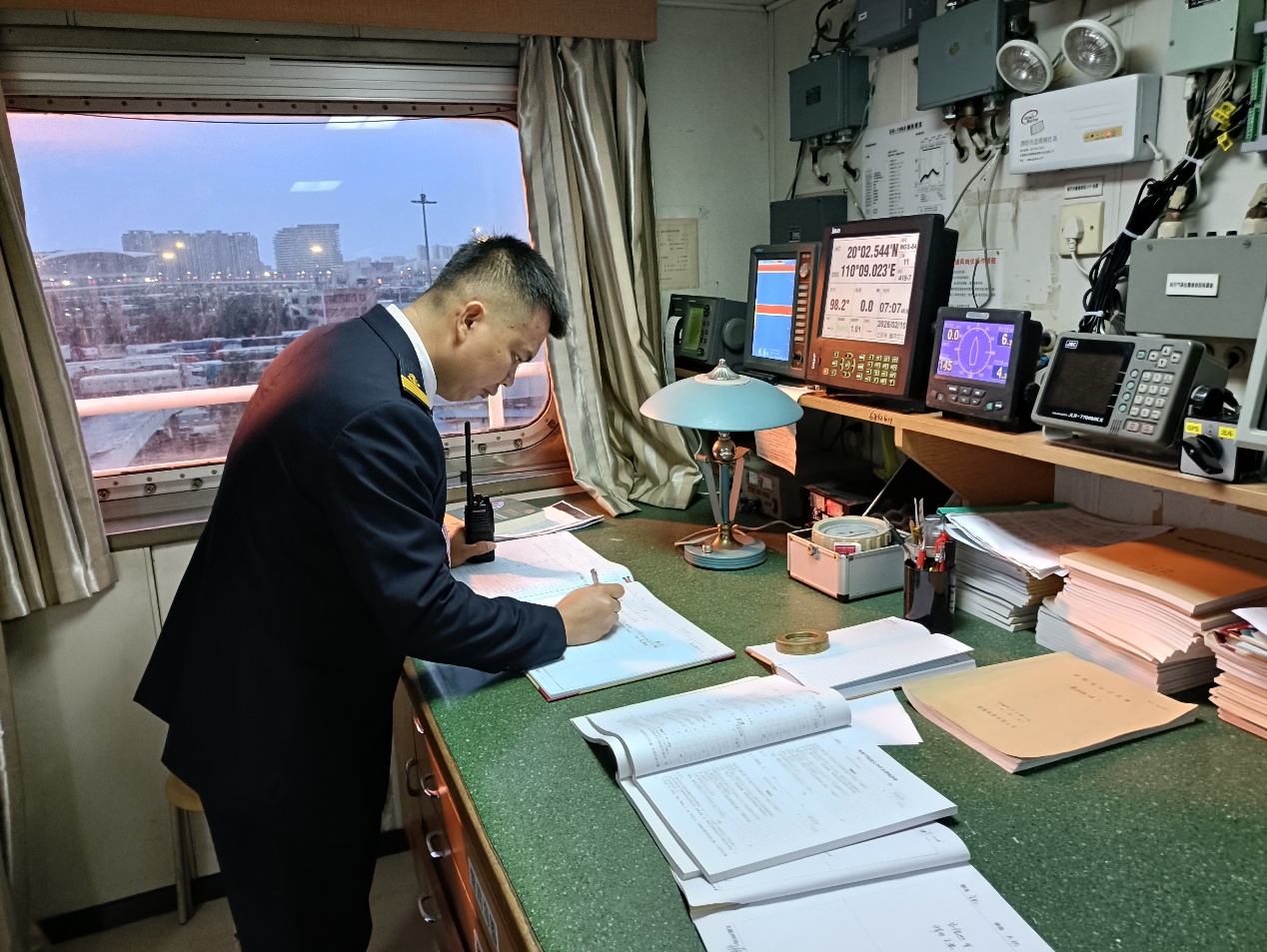 7时整,方浩登上粤海铁2号,快步走向驾驶台。与交班船长细致沟通船舶状态、装载进度、航线情况后,他郑重地在交接记录上签下名字,正式接过了这艘万吨巨轮的指挥权。