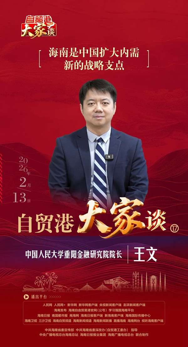 迈入全岛封关运作新阶段,海南自贸港如何进一步扩大金融对外开放;如何发挥开放政策集成效应,更好释放消费潜力、扩大有效投资?《自贸港“大家”谈》将于2月13日播出第十七期,对话中国人民大学重阳金融研究院院长王文。