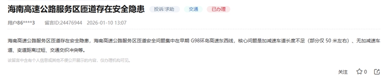 收藏人民网海口2月13日电 (吴占桂)近日,有群众通过人民网“领导留言板”反馈,海南高速公路服务区匝道存在不容忽视的安全隐患。据留言内容显示,G98环岛高速东西线服务区匝道加减速车道长度不足,部分区域甚至未设置加减速车道,导致车辆变道距离严重不足,交通交织冲突现象频发,极易诱发交通事故。【留言详情】