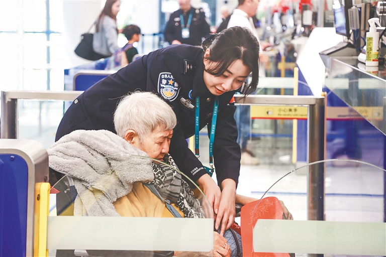 ③ 2月16日,海口美兰边检站,执勤民警为特殊旅客开通绿色通道帮助通关。海南日报全媒体记者 袁琛 通讯员 孙浩戎 摄