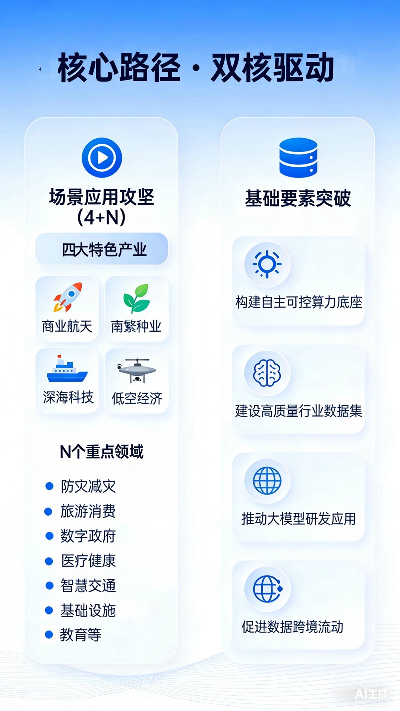 收藏近日,《海南省推动“人工智能+”行动方案(2026—2028年)》正式发布,方案明确提出“4 + N”场景攻坚方向、双核驱动布局以及七大重点行业应用规划。三年之后,海南的AI产业版图将会呈现出怎样一番景象?一组图片,为您解读。