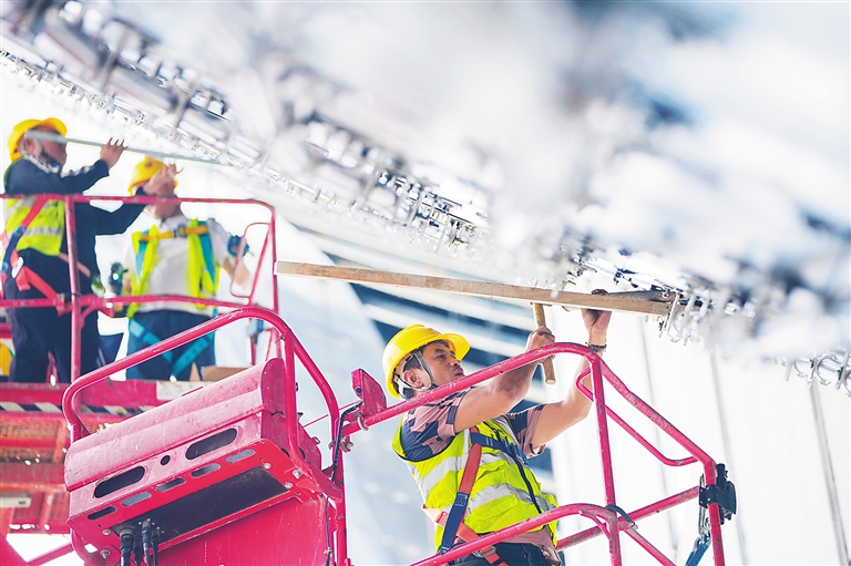 2月26日,位于三亚湾的中国海南国际文物艺术品交易中心和海南国际文化交流中心(简称三亚“双中心”)施工现场,工人们加快推进项目建设。