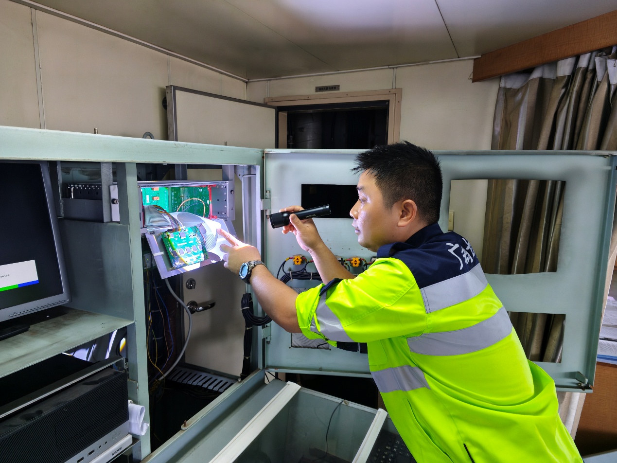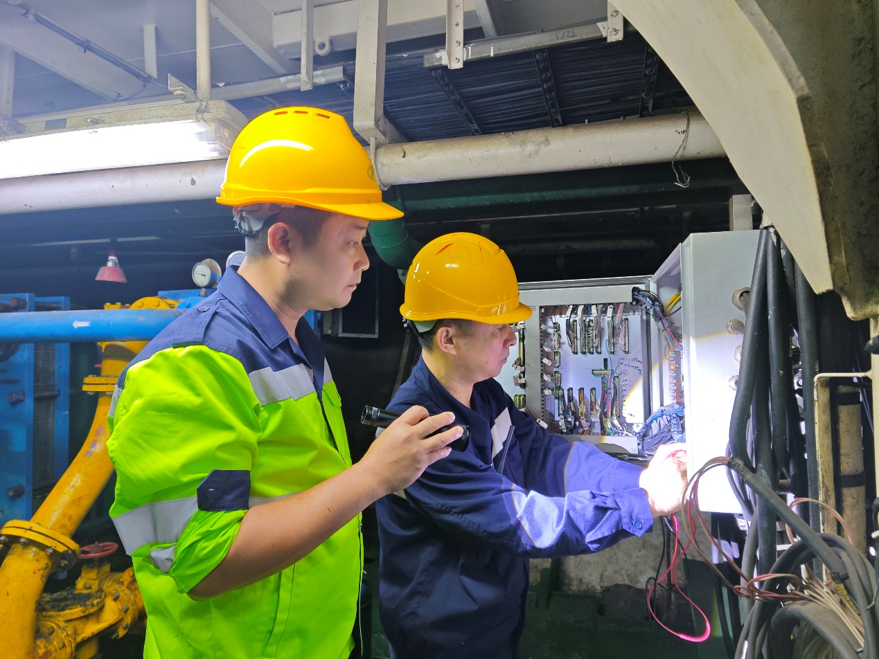 “立即登船!”吴清亮带领检修组火速赶到。初步排查更换传感器和执行机构后,故障依旧。关键时刻,吴清亮果断调整方案,下令对遥控控制系统线路进行“地毯式”梳理。在狭窄的空间里,他们逐段测试通断,仅用20分钟便将故障点锁定在主机本地控制系统与723遥控转速控制系统的接口线路上。