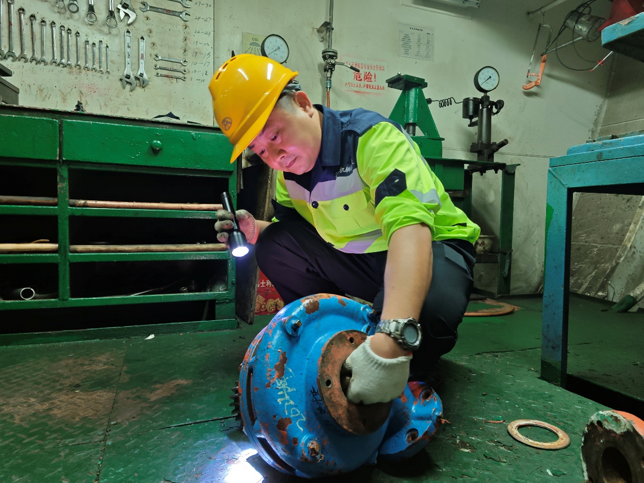 随后,团队分工协作,拆卸、清洁、测量间隙、更换部件……每一个动作都标准规范。14时30分,损伤部件修复完毕,空压机重新轰鸣运转。吴清亮常说:“修船如治病,只有找准病灶,才能药到病除。”