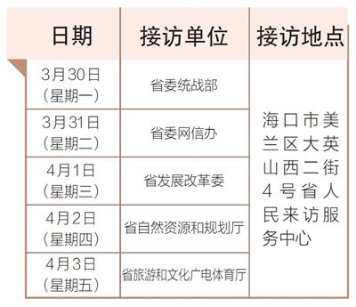 3月30日至4月3日,省委统战部、省委网信办、省发展改革委、省自然资源和规划厅、省旅游和文化广电体育厅相关负责人将在海口市美兰区大英山西二街4号省人民来访服务中心接访群众。