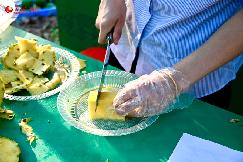 “这凤梨是在榴莲树下长大的。”海南省优旗农业有限公司项目部刘俊宇在展台前麻利地削着凤梨皮,向围观的游客介绍。他带来的是育才生态区榴莲基地里套种的“金菠萝”。由于使用了自家工厂生产的鱼蛋白肥进行滋养,这批首次上市的金菠萝水分足、甜度高。“带来100多个,就剩这几十个了。”刘俊宇指着空了大半的筐说。这不仅是农产品的热销,更是育才生态区立体农业模式的首次市场检验,土地产出效益通过品种搭配实现了最大化。