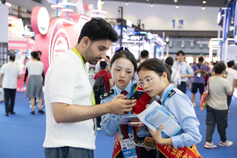 在绿地控股馆伊朗藏红花展位,重庆税务干部陈澜用流利英语讲解境外投资者再投资抵免政策;韩国展区内,保亭税务干部苏峰用韩语翻译政策资料,与展商互加微信建立长效对接;墨西哥客商的跨境涉税问题,由西班牙语人才陈雨含精准解答,用专业服务传递税收温度。